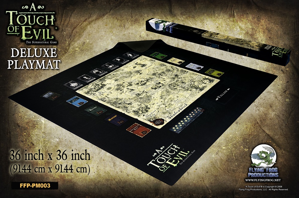 This 36 inch x 36 inch (91.44cm x 91.44cm) soft-touch deluxe neoprene playmat adds a bit of color and style to your gaming table. It features the A Touch of Evil game board printed at large size on the playmat, as well as spaces for all of the card decks, discard piles, and other elements of the game, and is perfect for rolling dice and picking up cards during your monster-hunting gothic horror adventures.
