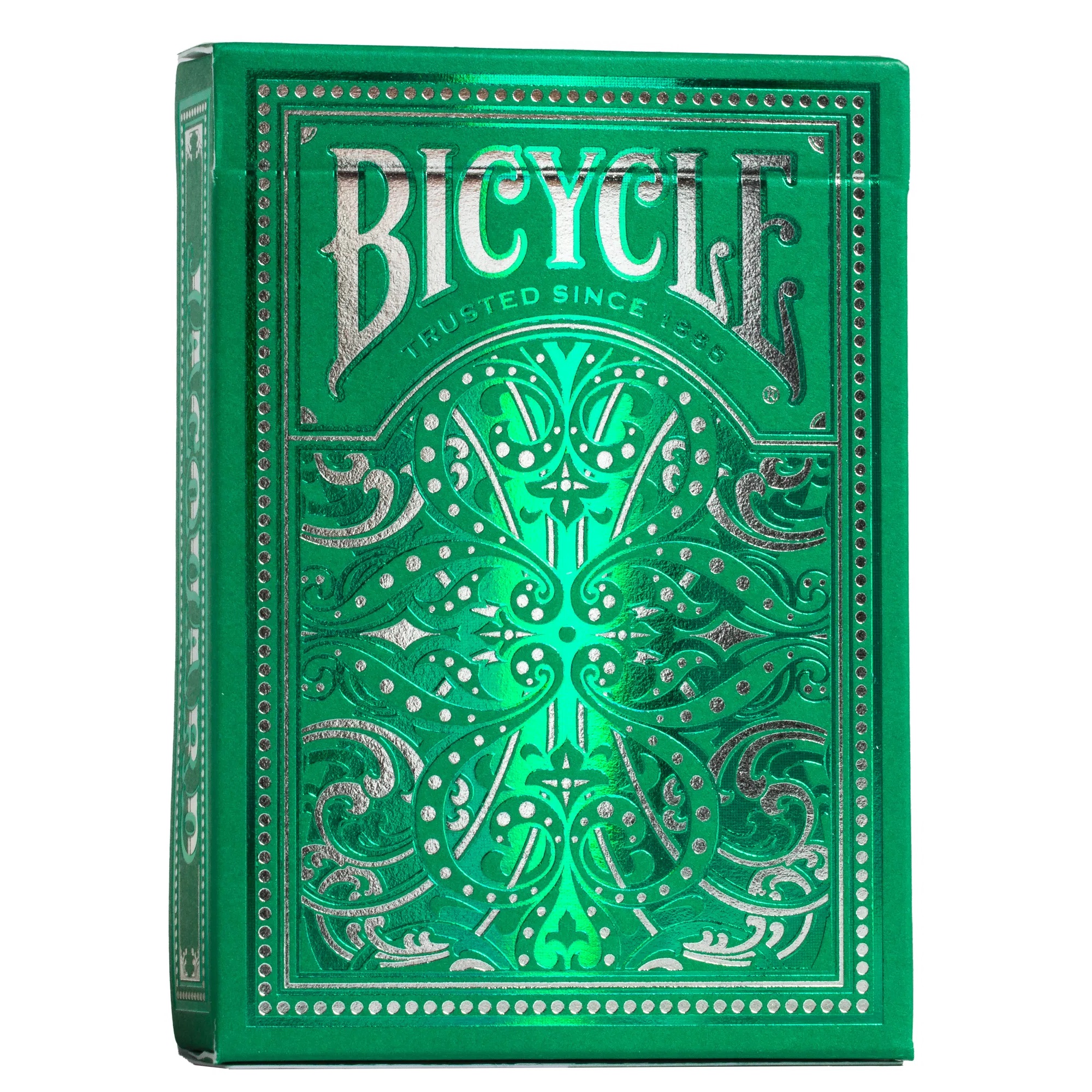 Bicycle Jacquard gets its design inspiration from complex, ornate patterns often woven into fabric resulting in beautiful displays. The Bicycle Jacquard tuck case features emerald green and silver foil details woven throughout creating a dazzling and dramatic appeal. Just as Jacquard machines revolutionized Looms with their “chain of cards” operation, this premium deck of cards has been designed and manufactured with the same sophistication and innovative technology.