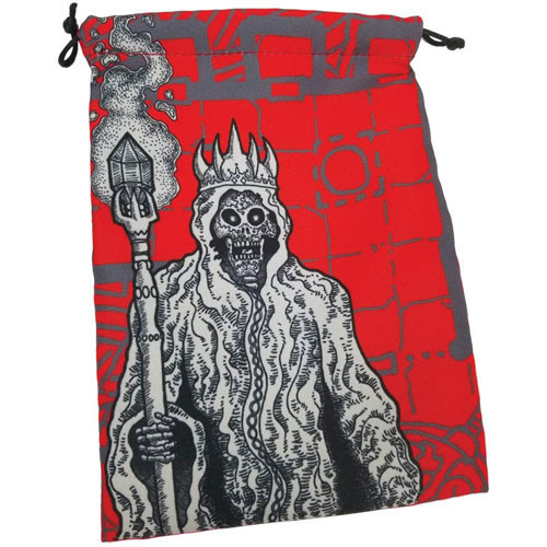 What should you do if you have too many dice? (Well, that's silly, because you can NEVER have too many dice!) But what you COULD do is pick up this dice bag! This striking (and roomy) fantasy-themed dice bag will help you keep all those treasures right at your fingertips. The drawstring bag is made of red fabric, lined with black satin, and holds more than 100 assorted dice! This lich-adorned 6" x 9" bag will be a valuable addition to your next game day, no matter where you play!