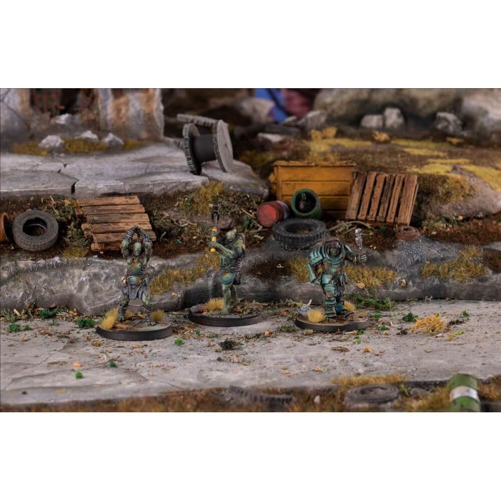 Super Mutants love to hunt and eat. If that means shooting down (mostly) defenceless ‘meat bags’ from afar or blowing their next meal into chunks will explosives, they are happy to do so. Their favourite method of ‘food preparation’ however is to get up close and personal and batter their next meal into submission with whatever comes to hand, be it twisted pipe or rusted tool. As long as the food is suitably tenderised and stops moving, they couldn’t be happier. This boxed set contains three 32mm scale multi-part high quality resin Super Mutant miniatures, each with unique scenic bases, to allow players to expand their Fallout: Wasteland Warfare games