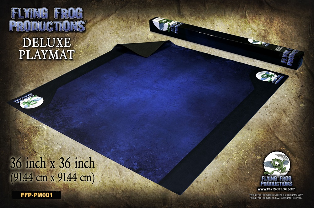 This 36 inch x 36 inch (91.44cm x 91.44cm) soft-touch deluxe neoprene playmat adds a bit of color and style to your gaming table. It features the Flying Frog logo, as well as a colorful blue and black textured artwork playfield, and is perfect for laying out boards on, rolling dice, and picking up cards.