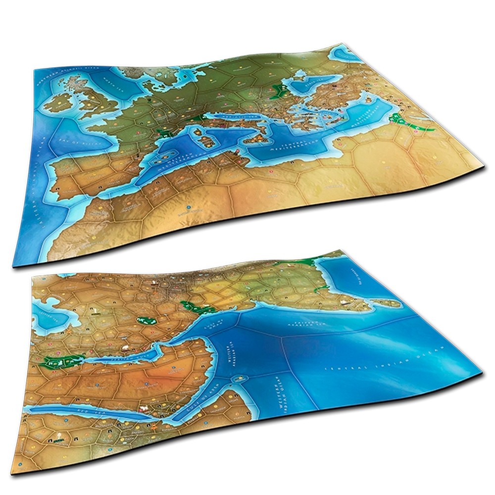 To complement such a grand game, Ares Games has taken a further step by producing the Mega Empires: Deluxe Game Mats – The West and The East. These giant neoprene playing mats, measuring 130 x 90 cm and laser-cut for precision, offer an enlarged playing area for easier gameplay.