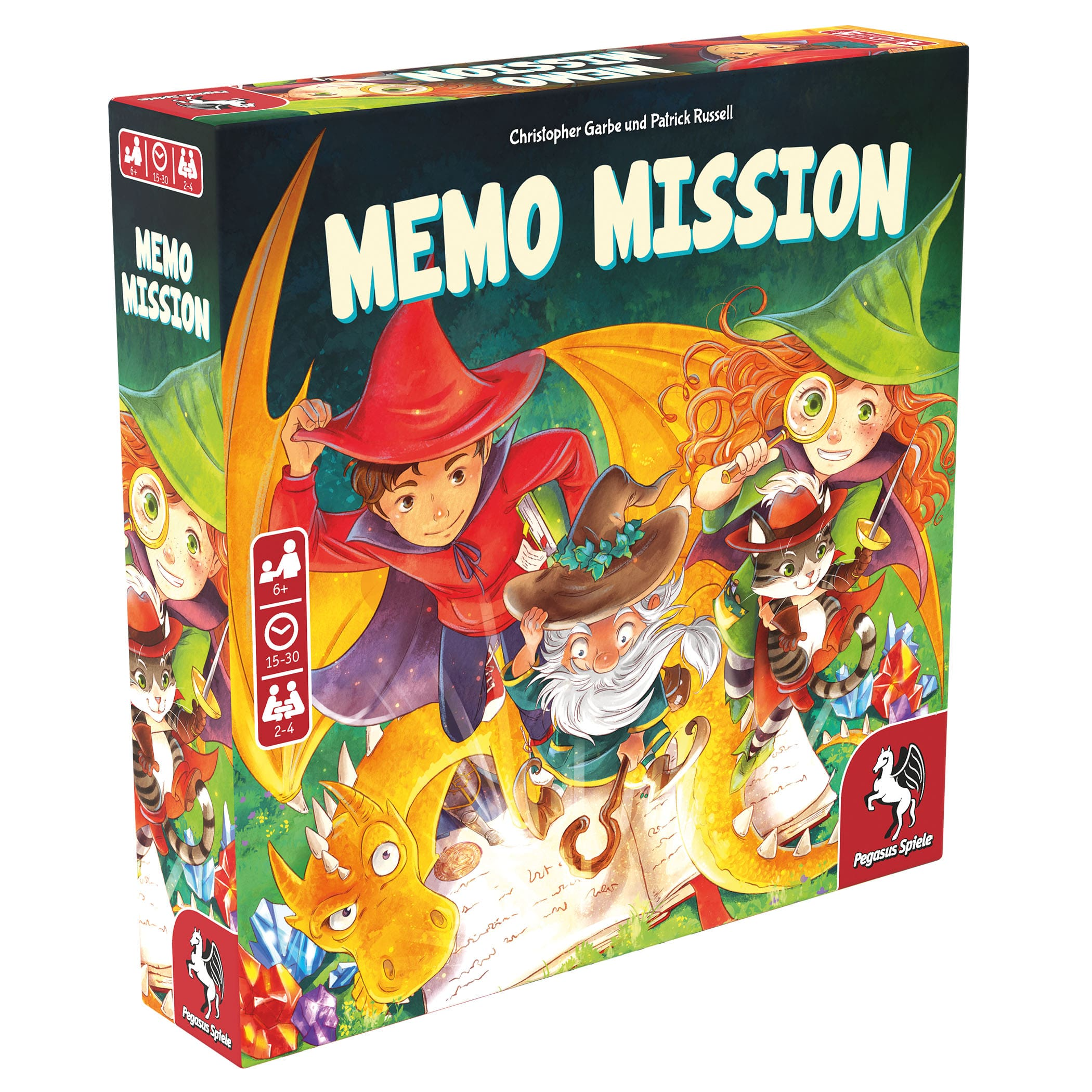 With Memo Mission, gamers can once again immerse themselves in the magical world of the Wizardry to the Power of Three game series. In the course of the game, they experience various missions, which they must complete in the correct order to obtain valuable crystals. In order to uncover the motifs sought on the mission cards in the correct order, they must always remember where tiles lie in the 5x5 grid, even during the other players' turns. The player who finds all motifs of the current mission on their own turn can fulfill it. Potions help in tricky situations and allow special actions once per game such as secretly looking at two tiles.