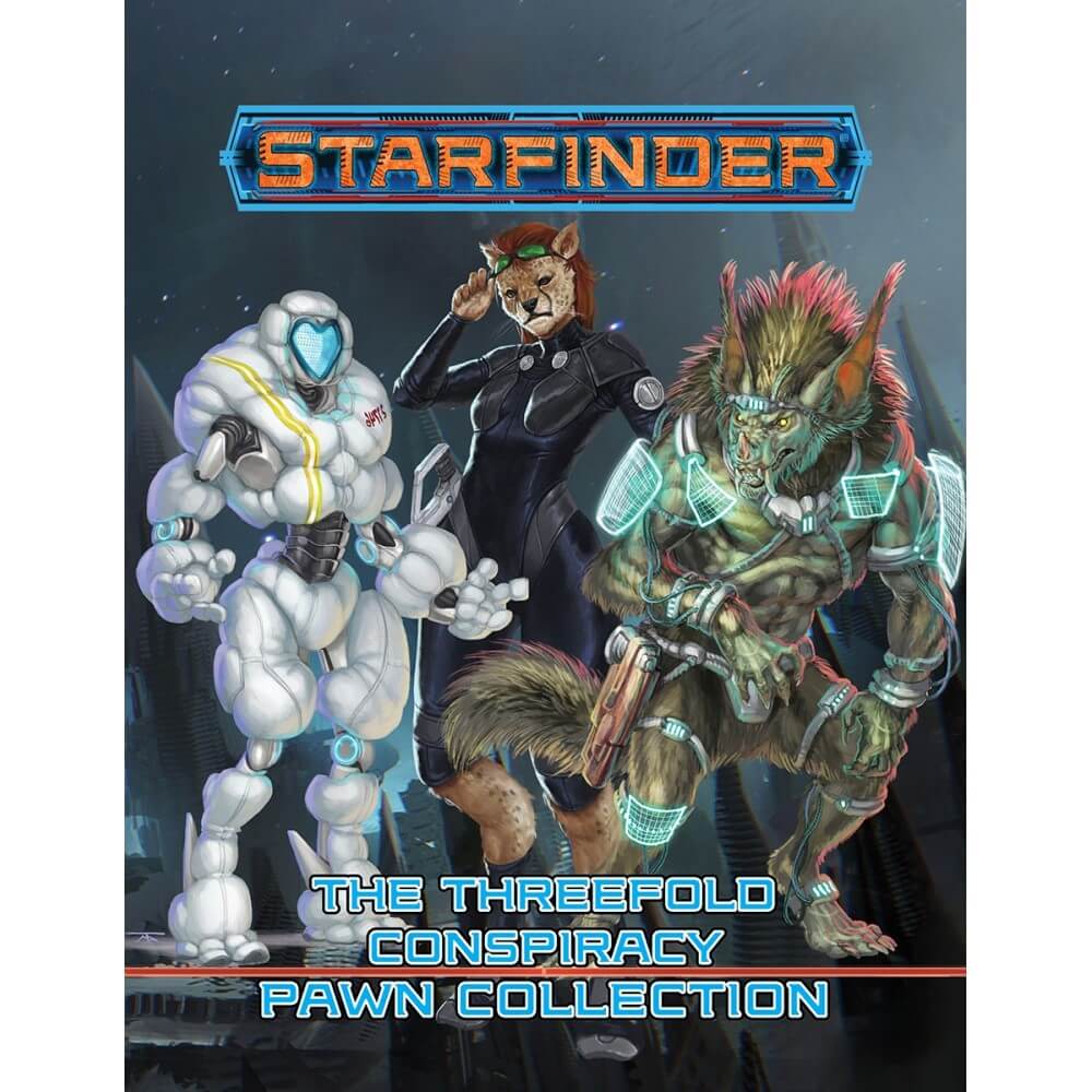 Key aliens and NPCs from Starfinder's Threefold Conspiracy Adventure Path come alive on your tabletop with The Threefold Conspiracy Pawn Collection, featuring more than 100 creature pawns for use with the Starfinder Roleplaying Game or any tabletop science-fantasy RPG! Printed on sturdy cardstock, each pawn presents a beautiful full-color image of an alien, NPC, or starship from The Threefold Conspiracy campaign, including agents of the mysterious Unseen, strange shapeshifters, uneasy allies, and dozens of unique creatures.
